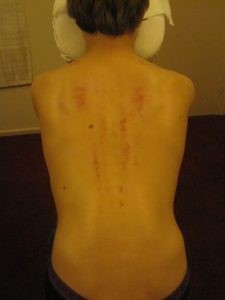Bij de behandeling breng ik een speciale guasha olie op de huid aan. Op de plaats waarop de olie is aangebracht schraap ik met een Guasha steen over de huid. Door het schrapen stimuleer ik de doorbloeding in het bindweefsel en wordt de huid rood. Op plaatsen waar blokkades zitten door afvalstoffen, verschijnen “bloeduitstortingen” (Sha) in de huid (niet op de huid). Deze variëren van diep rood tot paars. Deze rode vlekken verdwijnen binnen een paar dagen na de behandeling.